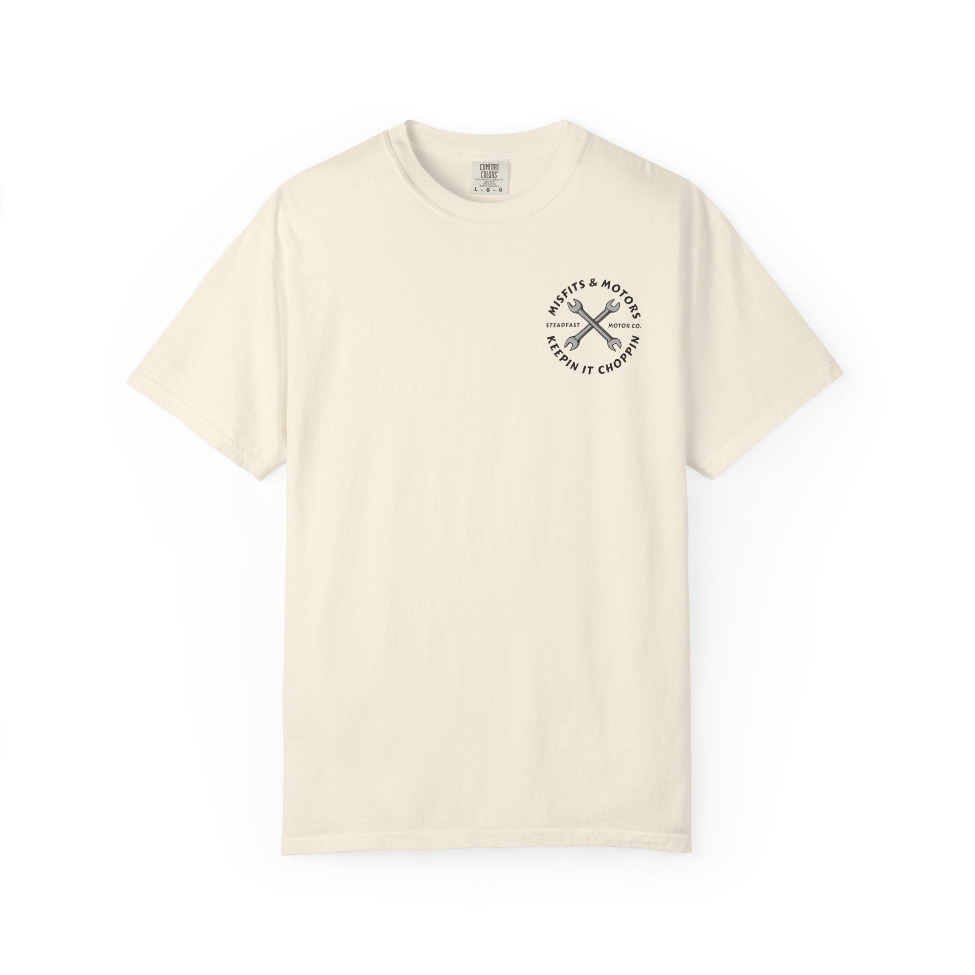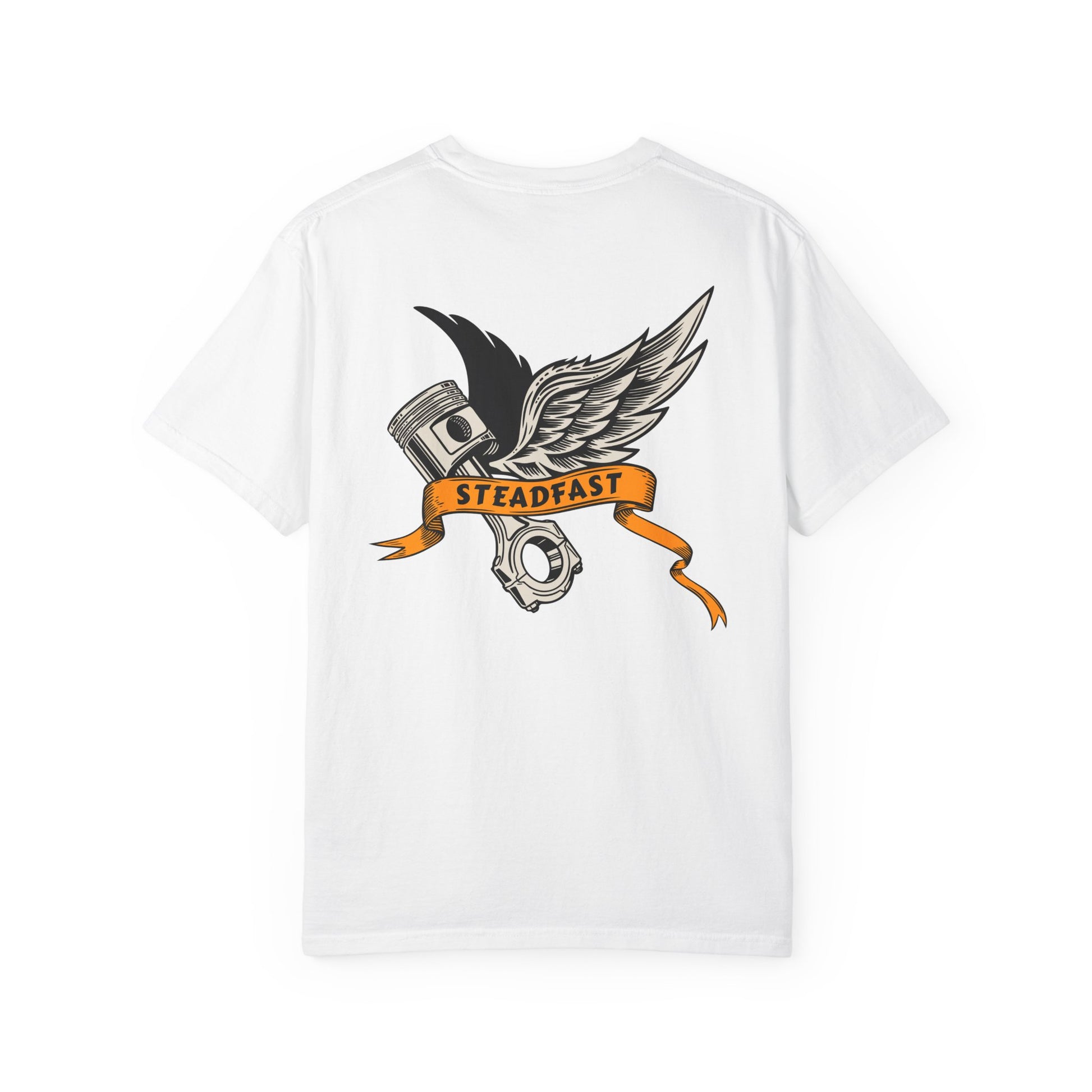 A rugged, lived-in tee that feels like an old favorite from the first wear. This heavyweight garment-dyed shirt softens with each wash while keeping its structure—double-needle stitching and tubular knit mean it’s built to last. The front bears a small, stamped emblem over the heart; the back shows a bold, vintage motor-inspired graphic: a piston, wing, and flowing banner that reads “STEADFAST.” It’s the sort of shirt you reach for when you want something that looks road-worn and real—whether you’re wrenching in the garage, heading out for a weekend ride, or meeting friends at the local shop. The relaxed fit and pre-shrunk ring-spun cotton give comfort without floppiness. Available in a wide range of colors and sizes from S to 4XL, it wears in, not out.